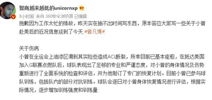 北京时间10月24日,据知名选秀专家王健透露声称,目前,曾凡博已经成功与G联赛的点燃队完成了汇合,在加盟球队之后,点燃队自然也是对曾凡博十分重视,他们已经将曾凡博视为球队重点培养的锋线球员,并且希望曾凡博能够通过点燃队这个平台进入到NBA之中。王健表示,之前曾凡博在全运会对阵陕西的那场比赛之中出现的伤病情况曾经一度非常危险,经专家诊断之后我们可以得知,曾凡博差一点就遭受到了十字韧带撕裂的伤情。