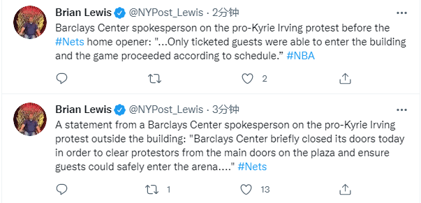 对于球迷抗议支持欧文这件事,巴克莱中心发言人发表声明:巴克莱中心今天暂时关闭了大门,以清除在球馆正门的抗议者,并确保球迷可以安全进入球馆;只有持票的球迷才能进入球馆,比赛按计划进行。