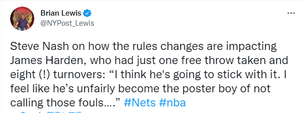 篮网输球赛后,纳什表示詹姆斯-哈登受到了联盟关于犯规新规则的不公平对待,他称哈登为新规则的“海报男孩”。