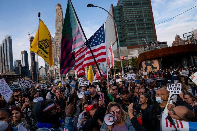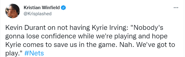 三场战罢,杜兰特总共拿到99分,场均轰下33分却仅仅带队拿到一场胜利,在这样的情况下,杜兰特开始想念欧文了;值得一提的是,今天有部分抗议者在巴克莱中心球馆外大喊“不要疫苗规定,让欧文打球”的口号。