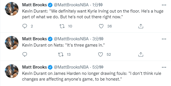 对于哈登不再被犯规这件事,杜兰特表示:说实话,我认为规则的改变不会影响任何人的比赛。杜兰特还表示现在已经打了三场比赛,我们绝对希望凯里-欧文在场上,他是我们球队的重要组成部分,但他现在不在那里,当我们比赛时,没有人会失去信心,但不指望欧文能在比赛中拯救我们。
