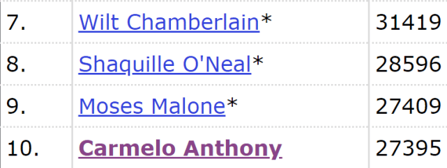 第二,安东尼目前生涯总得分是27395分,排名历史第10位,他只需要再得到14分,就能追上摩西-马龙(27409分),升至NBA历史得分榜的第九位。安东尼在前两场常规赛场均得到12.5分,如果他的状态不错,完全有机会在对灰熊的比赛中达成这一成就。得分榜排名第八的是奥尼尔(28596分)。