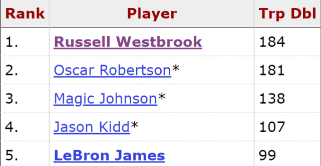 第一,生涯至今,詹姆斯已经打出99次三双,再拿一次三双,他就能达到100次三双的里程碑。目前,NBA历史上只有4名球员的三双次数达到至少100次,他们是威斯布鲁克(184次)、罗伯特森(181次)、“魔术师”约翰逊(138次)和基德(107次)。詹姆斯有望很快加入他们的行列。