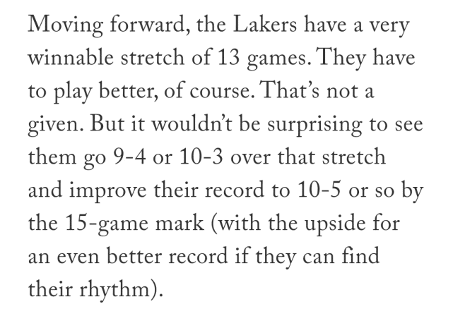 当然,对于湖人来说,最重要的还是力争迎来常规赛首胜,提振全队的士气。洛杉矶记者Jovan Buha指出,湖人接下来的赛程其实非常有利,他们未来的13场比赛对手整体实力不强,湖人完全有可能取得9胜4负,甚至10胜3负的成绩。Buha相信,只要湖人在这些比赛中进入节奏,等到接下来的13场比赛打完,湖人前15场常规赛的战绩可能是10胜5负甚至更好。