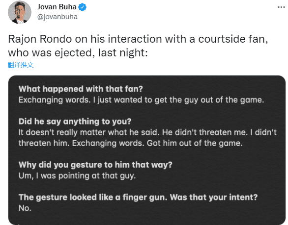 在昨天湖人和太阳比赛中,朗多对场边的安保人员示意场边球迷有不妥的言语,朗多指着该球迷,后者随即还拍了一下朗多的手,随后安保人员把这位球迷请出了球场,该球迷的女伴也跟着一起走了,