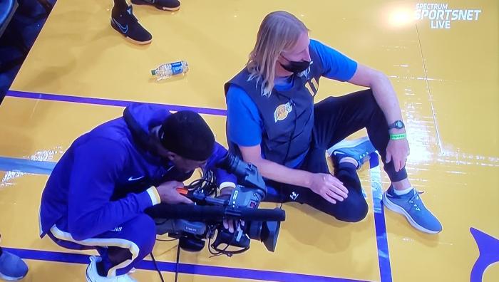与太阳一战,朗多替补上场13分钟5投2中拿到6分4篮板3助攻,三分3投2中,在场上的表现还是很不错的;上半场没有上场期间,郎指导化身摄影师,蹲着摄影十分认真。