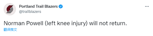 鲍威尔是在第二节5分多钟受伤离场并且返回更衣室,之后没有重返替补席,经过检查之后,开拓者官宣鲍威尔因左膝受伤而退出比赛;今日对阵太阳,鲍威尔首发出战12分钟,8投6中、三分4中2拿到16分2篮板,在场正负值+16,他是开拓者半场领先20分的一大功臣。