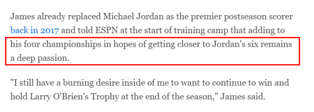 早在2017年,詹姆斯就已经超越乔丹,成为NBA季后赛历史得分王。不过,这并不能让他满足。他在今年训练营开始时告诉ESPN,在四座总冠军的基础上继续增加数量,接近乔丹的六座总冠军,让他满怀激情。
