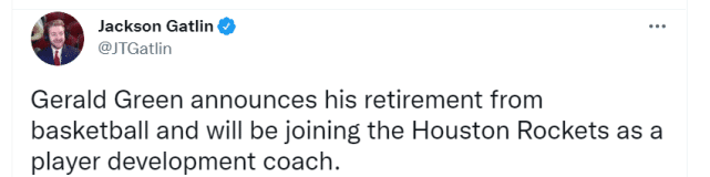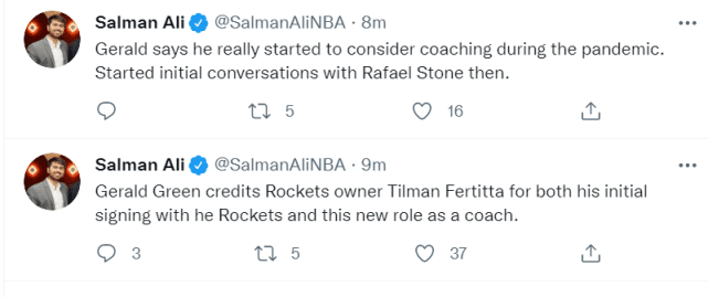 格林在采访中表示,自己在疫情期间考虑了成为教练的可能,并在那时候和火箭总经理斯通有了初步的交流。他感谢火箭老板费尔蒂塔和总经理斯通给了他机会,包括当初以球员身份签约以及如今以一名教练的身份回归。