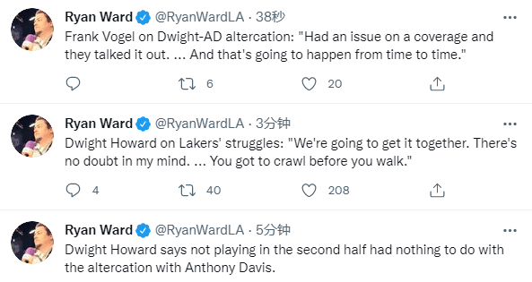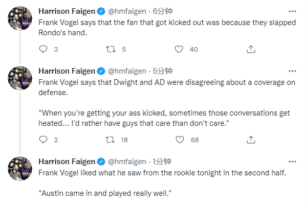 赛后湖人主帅沃格尔也谈到内讧这件事,他表示:有问题就要说出来,这种事会时不时地发生;沃帅还表示浓眉和霍华德对防守有分歧,沟通时出现了误解:当球队被打爆时,这种对话会变得激烈,我希望有人关心而不是相互冷漠;沃帅也表示霍华德下半场被弃用只是想尝试小个阵容。