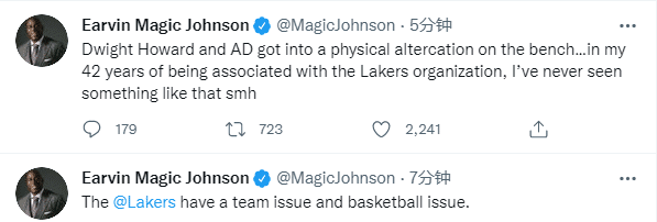 对于湖人内讧,湖人名宿魔术师发推写道:霍华德和浓眉在替补席上发生了肢体冲突,在我42年的湖人队生涯中,我从未见过这样的场面,湖人团队内部和篮球都有问题。