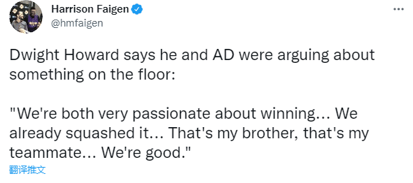 尤其是浓眉和霍华德之间的争吵冲突事件,赛后霍华德本人回应此事,他表示他和浓眉发生了分歧,不过他们已经双方已经解决了这件事,霍华德还表示:浓眉是我的兄弟,我的队友,我们都对胜利充满热情,我们之间现在没问题了。
