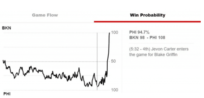 这场比赛篮网能够逆转堪称是奇迹,要知道的是比赛中他们的输球概率一度高达94.7%,这是比赛进行到最后5分32秒时,费城领先10分,这个时候篮网输球的概率是94.7%,赢球的概率是5.3%,看起来几乎没有希望。