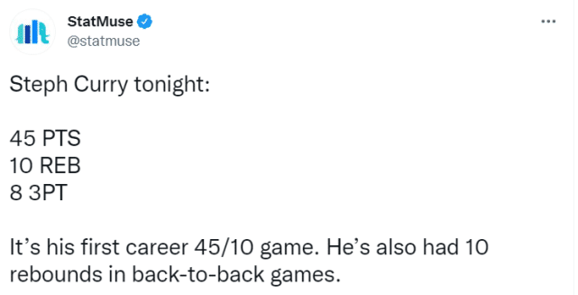 第四,这是库里生涯第一次打出得分篮板45+10的比赛,目前,他连续两场抢到10个篮板。
