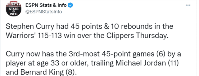 第七,自从来到33岁以后,库里已经有6场比赛至少得到45分,这也让他排在历史第三,仅次于乔丹(11次)和伯纳德-金(8次)。