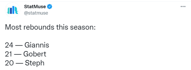 第五,常规赛至今,总篮板排名前三的球员依次是字母哥(24个),戈贝尔(21个),库里(20个),有球迷给库里起了新外号:金州板王。