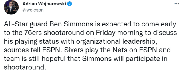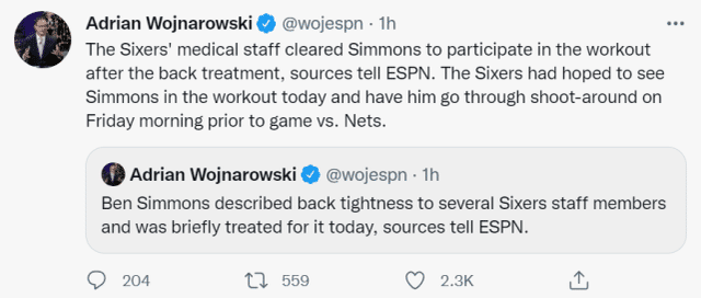 沃纳罗斯基报道称,西蒙斯告知76人队自己遭遇“背部紧张”的问题,没有参加个人训练并接受了队医的治疗。队医对他进行简短的治疗后,认为他已经可以恢复训练。沃纳罗斯基还表示,西蒙斯尚未完全参加球队的训练,基本无望在对阵篮网的比赛中出场。最新消息是西蒙斯将在当地时间周五上午与管理层讨论他的出战状态,球队希望他参加当天的投篮训练。