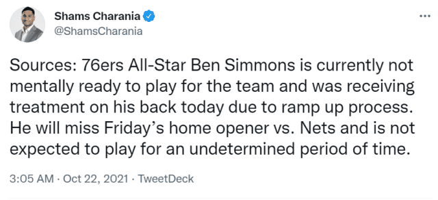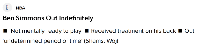 现在,他又提出了自己背部有伤的理由,似乎仍不想为76人上场。虽然西蒙斯已经回到球队中,但查拉尼亚报道称,他的心情很不好,而且心理上也没做好出战的准备。