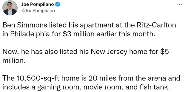 另据记者Joe Pompliano报道称,继上个月将一套费城的公寓挂牌300万美元出售后,西蒙斯将另一套费城附近的豪宅也挂牌了,价格是500万美元。这套房产距离球馆大约20英里,占地面积是10500平方英尺(约975平方米),配备有游戏室、私人电影院等设施。