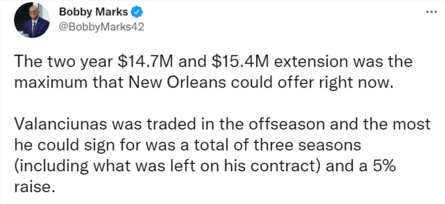 薪金专家鲍比-马克斯表示,瓦兰续签的两份合同年薪分别是1470万和1540万,这已经是鹈鹕目前能提供的最高薪水了。瓦兰休赛期通过交易来到球队,他能签的最长合同就是总计3个赛季(包括原先合同余下的1年),而且每年的增幅是5%。