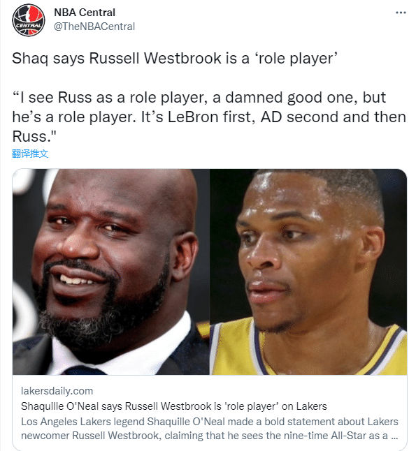 奥尼尔言论引争议:詹姆斯才是湖人老大,而威少只是角色球员