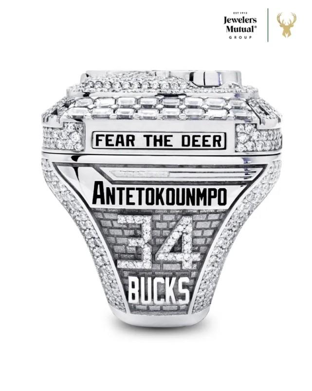 雄鹿戒指的一侧是雄鹿的口号FEAR THE DEER,球员的名字,球员的号码,而另一侧是Bucks in 6, 代表雄鹿6战夺冠,还有雄鹿每一轮季后赛的比分以及2021年夺冠的标志。