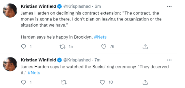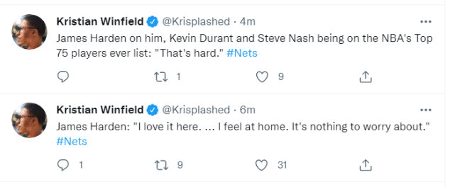 最后,哈登谈到了自己未和篮网提前续约的话题,表示他目前专注于保持健康。哈登说:“合同和钱会在那里。我没有计划离开这支球队。我爱这里,我觉得这里像家,没什么可担心的。”哈登还感慨自己、杜兰特和纳什入选75大巨星很酷。新赛季才刚刚开始,无论对于哈登还是篮网,球迷都需要一些耐心。