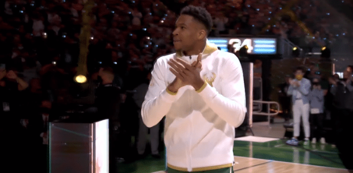 26岁字母哥身穿白色连帽衫,最后一个亮相并且举手向球迷示意,看到总冠军戒指时一脸喜悦和惊喜;领取戒指后,全场球迷为字母哥高呼MVP;上赛季季后赛,字母哥场均轰下30.2分12.8篮板5.1助攻1.2盖帽1抢断,总决赛G6狂砍50+14带队夺冠,全票当选FMVP。
