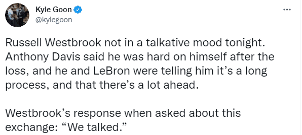 赛后威少在更衣室里很懊恼,浓眉和詹姆斯一起劝他说这是一个漫长的过程,还有很多事情要做;谈及这次对话后,威少表示他们已经谈过了;对于威少的表现,詹姆斯表示:我根本不担心威少,他只需要做他自己就行。