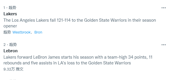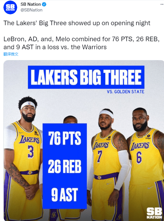 美媒SB nation发推写道:湖人三巨头正式首秀,詹姆斯、浓眉和安东尼合砍76分16篮板9助攻;并且用詹眉瓜的数据挡住威少的脸;名嘴斯基普-贝勒斯发推:Russell Westbrick。