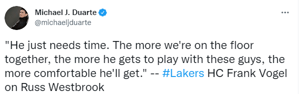 赛后,湖人主帅沃格尔表示威少需要更多的时间来融入球队,他会打得越来越好的;浓眉则是希望威少能够做自己,他表现不佳是因为威少太想让队友参与进来,而没有打出侵略性;今日一战,詹姆斯和浓眉都打出巨头该有的样子,威少太需要证明自己。