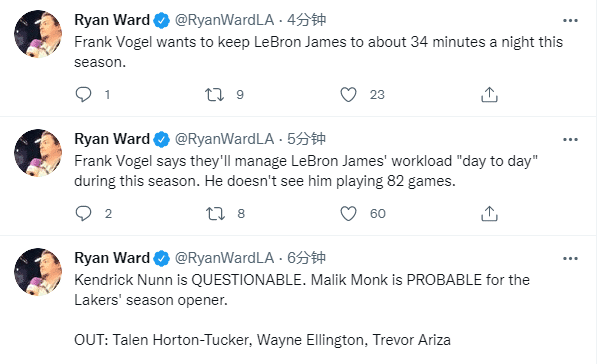 湖人揭幕战对阵勇士伤病报告出炉,韦恩-艾灵顿(左腿筋拉伤)将缺席首场常规赛,肯德里克-纳恩(右脚踝扭伤)出战成疑,马利克-蒙克(右侧腹股沟拉伤)大概率可以出战首场比赛。