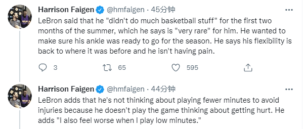詹姆斯还表示他从未考虑过减少上场时间以避免受伤,因为他在比赛中从不考虑受伤。他还说:当我的上场时间很少时,我会感觉更糟糕。