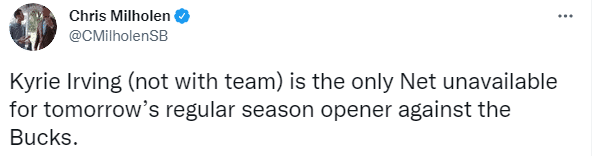 记者Chris Milholen还表示,除了欧文之外,其他球员都可以出战明天的揭幕战。
