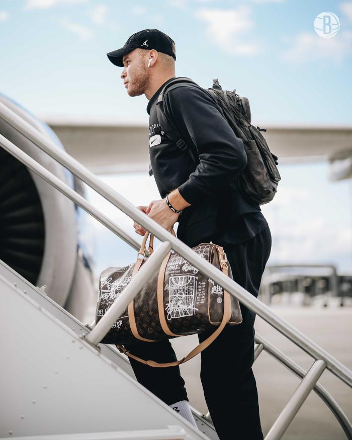 33岁杜兰特身穿黑色运动裤和灰色连帽卫衣,戴着一顶绿色针织帽,这款帽子是杜兰特最爱的;杜兰特背着双肩包,还提着一提绿色的手提包,听着音乐登上飞机,他的表情十分严肃,揭幕战对阵雄鹿,将是他的复仇之战。