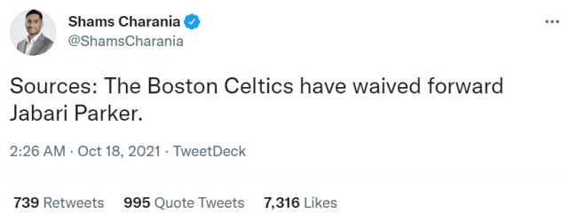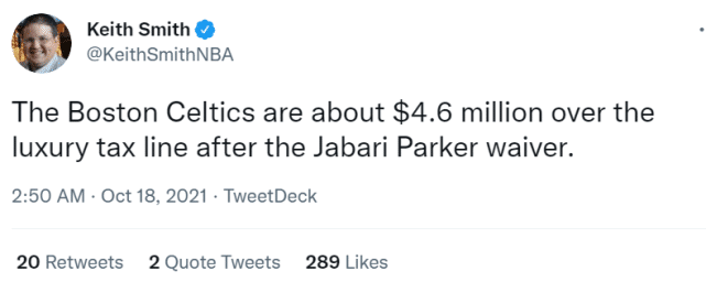 当然,裁掉帕克对于已经超过奢侈税线的绿军而言,可以省下更多的钱。NBA记者Keith Smith报道称,裁掉帕克后,凯尔特人超过奢侈税线的金额降至460万美元。