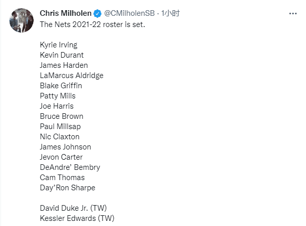 两笔操作之后,篮网17人大名单正式出炉——杜兰特、哈登、欧文、阿尔德里奇、格里芬、米尔斯、米尔萨普、乔-哈里斯、布鲁斯-布朗、克拉克斯顿、詹姆斯-约翰逊、杰旺-卡特、本布里、卡梅隆-托马斯和夏普。