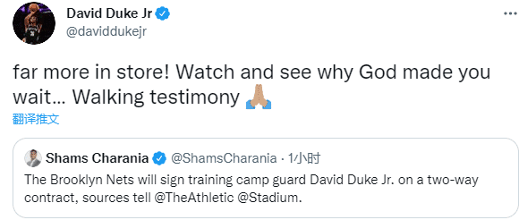 转为双星合同之后,杜克第一时间发推:还有更多要做!看看上帝为什么让你等待,让我们一起见证。