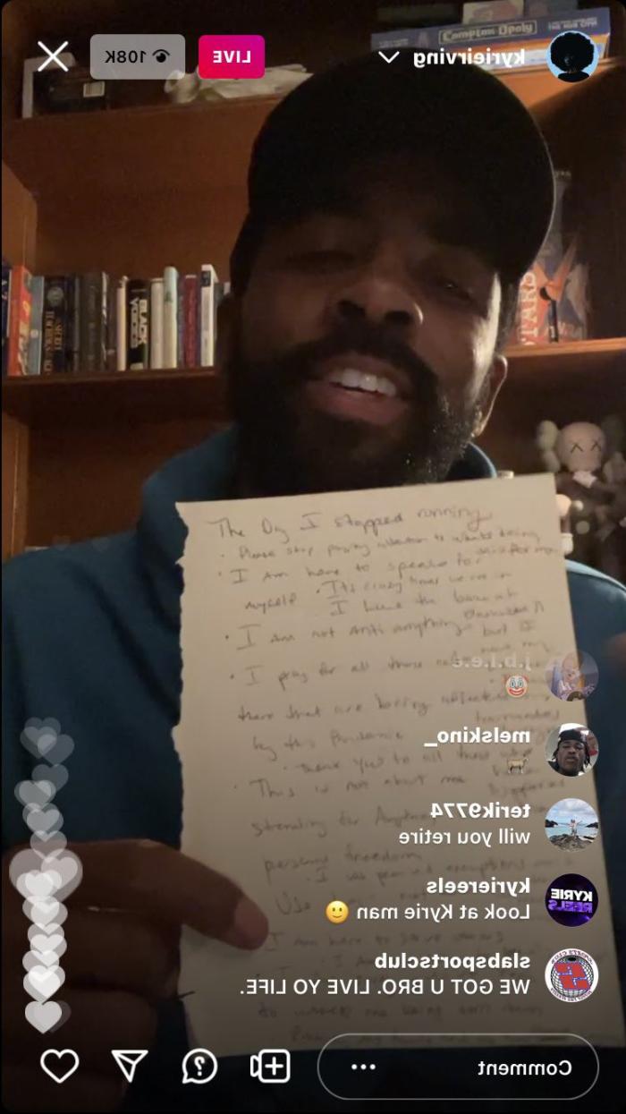 欧文表示他随时准备归队争夺总冠军,在直播中,欧文还晒出自己的笔记,篮网记者Alec Sturm看到欧文笔记中写着:;目前NBA官方还没宣布剥夺欧文的宗教豁免权,也没有欧文申请拒绝接种豁免权的消息,此前勇士球星维金斯申请豁免遭拒绝,之后他被迫接种了疫苗。