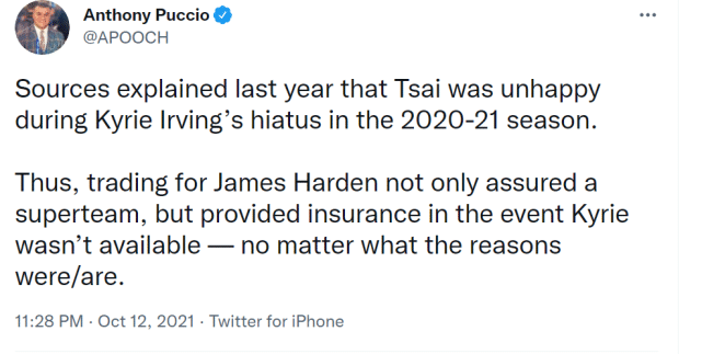 来源:24直播网10-13 19:3224直播网10月13日讯 ,篮网记者Anthony Puccio报道称,消息源透露,早在2020-21赛季,欧文因故缺席比赛时,篮网老板蔡崇信就已经不高兴了。他同意球队换来哈登,一方面是为了打造超级球队,另一方面就是为欧文准备一份保险,不管他未来因为什么原因缺席。
