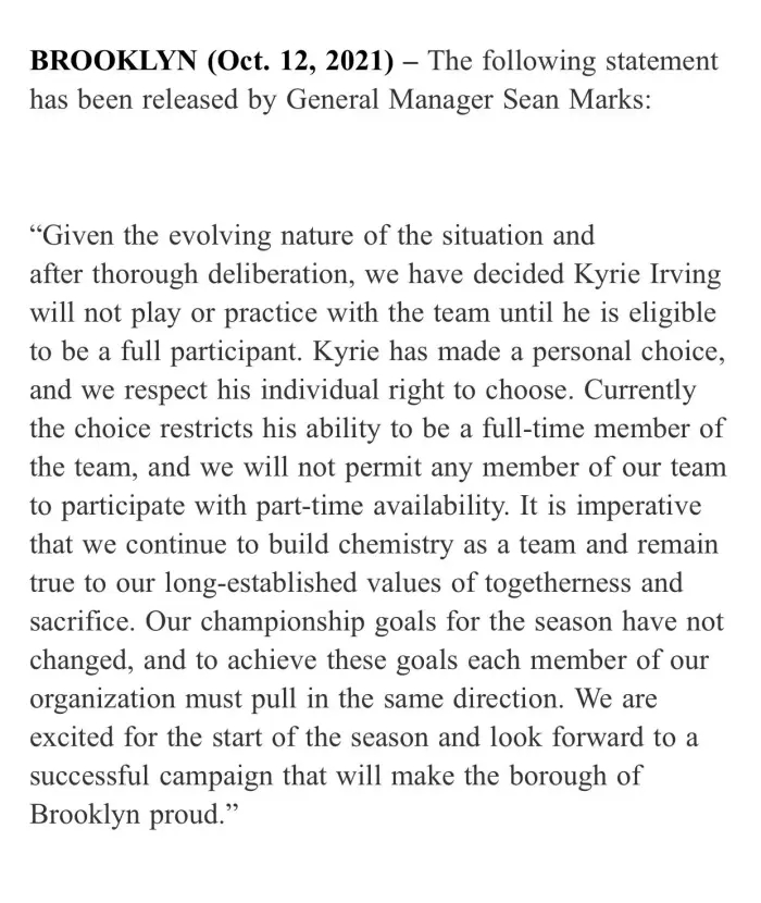 篮网这个决定强调“球队不接受兼职球员”这么做是为了维护队内的更衣室氛围,让球队其他人保持对争冠的信心。言外之意就是尽早宣布决定不让欧文事件影响其他人,细节可以理解为:除非欧文打疫苗,否则篮网不会让他上场,客场比赛也别打,但球队会支付他客场比赛的薪水!