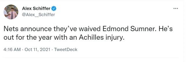 篮网还裁掉此前通过和步行者交易得到的萨姆纳,萨姆纳上赛季出战53场比赛,场均7.5分1.8篮板,投篮命中率52.5%。由于膝伤问题,萨姆纳本赛季预计报销。