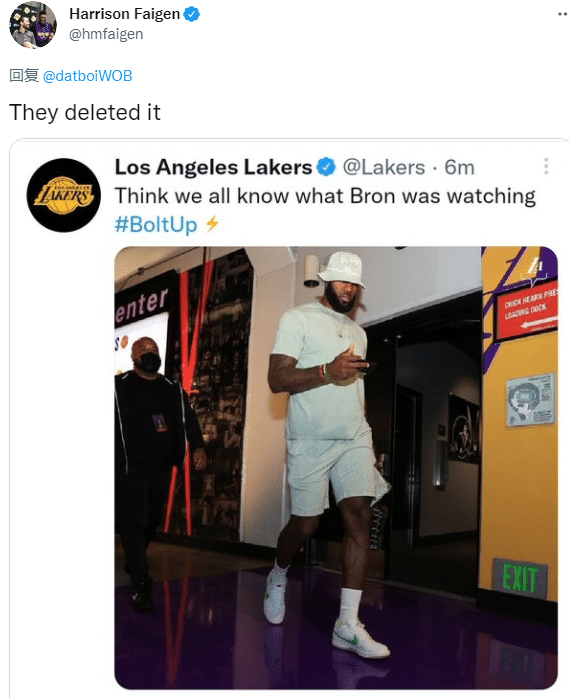 对阵太阳赛前,湖人官方曾晒出詹姆斯看手机的入场照,并且写道:我们都知道勒布朗在看什么?之后湖人官方晒出推文,但这条推人仍旧被曝光,记者Harrison Faigen晒出截图。