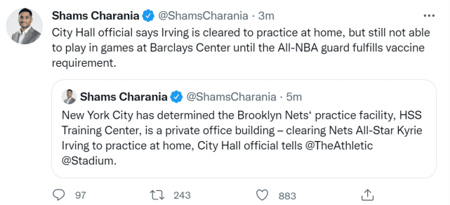 来源:24直播网10-09 16:5424直播网10月09日讯 ,据名记查拉尼亚报道,纽约市政厅的官员透露,纽约市已经认定篮网的训练场馆(HSS训练中心)是一个私人办公设施,这意味着欧文可以回归进行训练。不过,市政厅的官员也表示,如果无法达到接种疫苗的要求,欧文依然不能在篮网主场巴克莱中心打比赛。