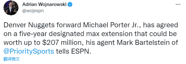 之后薪资专家BobbyMarks透露小波特新合同细节是,22-23赛季2980万美元,23-24赛季3210万美元,24-25赛季3450万美元,25-26赛季3690万美元和26-27赛季3930万美元。
