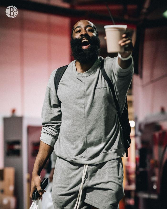 哈登身穿灰色套装,背着双肩包出发,一只手拿着一杯饮料,另一只手拿着两部手机并提着一个手提袋;哈登咧嘴大笑十分开心;在此前的媒体日上,哈登表示他已经100%康复,健康的大胡子回来了,新赛季目标直指总冠军。