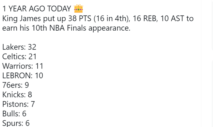 而依靠这场胜利,詹姆斯生涯第10次踏上总决赛的舞台。要知道在NBA总决赛历史上,只有三支球队进入总决赛的次数高于勒布朗,分别是湖人的32次,凯尔特人的21次以及勇士队的11次。而最终,詹姆斯也在去年总决赛成功收获了个人生涯第四座奥贝莱恩被,成为历史首位在三支球队都拿下FMVP的球员。