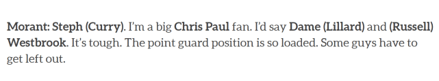谈到自己在当今联盟控卫中的排名时,莫兰特给出的答案是“前五”。当被问及其他四人是谁时,莫兰特说:“库里。我还是保罗的狂热粉丝,另外两个是利拉德和威斯布鲁克。控卫这个位置上的人才太多了,有些人会被遗漏。”