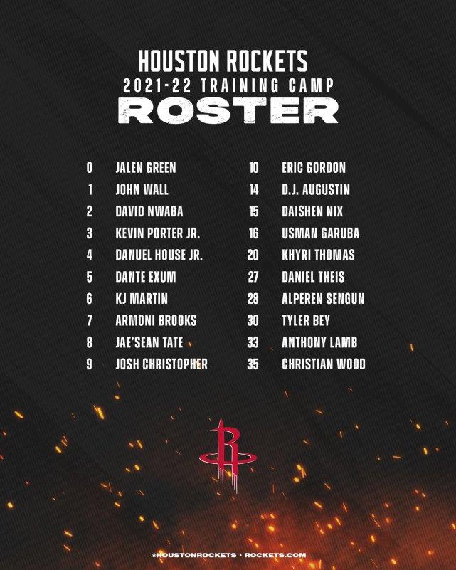 火箭的训练营名单具体如下:0号格林、1号沃尔、2号努瓦巴、3号小波特、4号豪斯、5号埃克萨姆、6号马丁、7号布鲁克斯、8号泰特、9号克里斯托弗、10号戈登、14号奥古斯丁、15号尼克斯、16号加鲁巴、20号托马斯、27号泰斯、28号申根、30号泰勒-贝(双向合同)、33号兰姆(双向合同)、35号伍德。