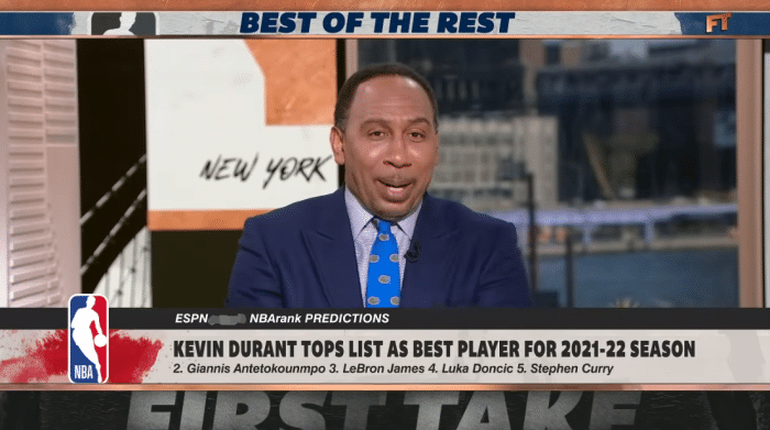 来源:24直播网09-26 15:0424直播网9月26日讯 ,权威体育媒体ESPN此前评选了新赛季百大球员,其中篮网巨星杜兰特力压上赛季FMVP字母哥排在第一。而近日,ESPN王牌评论员斯蒂芬A史密斯在节目中谈到了杜兰特与字母哥。